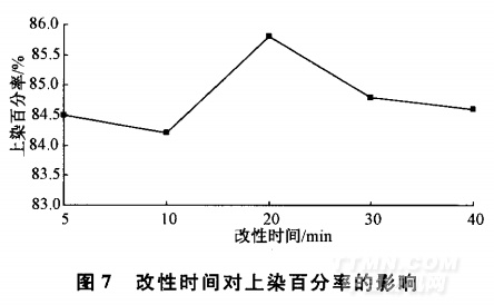 由图6可知,随着改性温度的升高,羊毛纤维的 上染百分率增加,当温度为60℃时达到最高;温度 继续升高,上染百分率有所下降。原因是随着改性 温度的升高,WLS向纤维表面吸附速率和扩散速率 加快,同时与纤维结合的速率加快,增强了改性程 度,使羊毛纤维上引入更多正电荷,从而增大了色素 与羊毛纤维之间的作用力,使上染百分率提高;当改 性温度过高,助剂在碱液中水解速率加快,改性效果 降低,使其与阴离子染料间的亲和力减小,导致染色 性能下降。因此最佳改性温度为6O℃。2.2.5改性时间的优选 按照1.2.2工艺,采用一浴一步法的改性工艺方法,在60 ℃条件下将羊毛纤维投入到用量10%(owf) WLS和30%(owf)碳酸钠的改性浴中,处理5~40 min,然后按1.2.3工艺染色,在温度为70℃,石榴 皮色素为10 mL条件下染色40 min,最后测定改性时 间对上染百分率的影响,结果如图7所示。