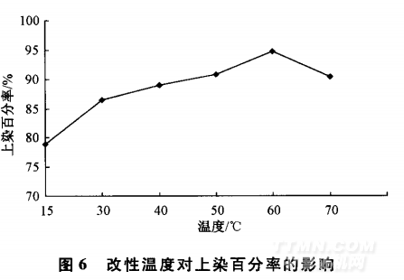 2.2.4 改性温度的优选 按照1.2.2工艺,采用一浴一步法的改性工艺, 在不同温度条件下将羊毛纤维投入到用量10%(owf)WLS和30%(owf)碳酸钠的改性浴中,处理20 min,然后按1.2.3工艺染色,石榴皮色素为10 mL,在温度为70℃条件下染色40 min,最后测定 不同改性温度时羊毛纤维的上染百分率,结果如图6所示。
