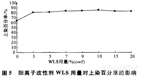 由图5可知,不加WLS时,上染百分率仅为64.63%,随着WLS用量的增加,上染百分率逐渐增 加,当用量为10%(owf)时羊毛纤维的上染百分率 可达85.83%,继续增加WLS用量,上染百分率几 乎不变。原因是随着WLS用量增加,纤维上结合的 助剂量增多,纤维引入的正电荷亦增多,从而使染料 结合量增多。但在一定浓度的碱液中,纤维素上的 羟基发生离解,生成一定量的Cell—O-,使得反应 达到平衡时所消耗的改性剂有饱和值。综上所述,WLS最佳用量确定为10%(owf)。