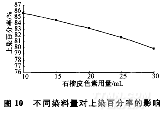 由图10可知,随着色素用量的增加,上染百分率下降。这是由于纤维上可上染的基团和位置是有限的,因此染料用量增大,上染百分率有所降低。