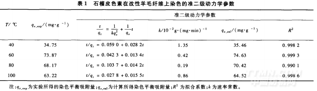 由图9可知,改性羊毛纤维染色的线性拟合曲 线在不同温度下均为直线型。从表1中的准二级动 力学模式相应的参数可知:回归系数值R 值均在0.99以上,且qe值与实验得到的qe,eal值比较接近,,所以准二级动力学方程能很好描述石榴皮色素上染 改性羊毛纤维的吸附过程。此外,由表1可知,染色 温度为40℃时,平衡上染百分率较低;当染色温度 为60℃时,平衡上染百分率最高;当染色温度超过60℃时,平衡上染百分率下降。这是因为染色温度(40℃)较低时,纤维膨胀程度小,染料上染纤维的可及度较小,平衡上染百分率低;当温度为60℃时,