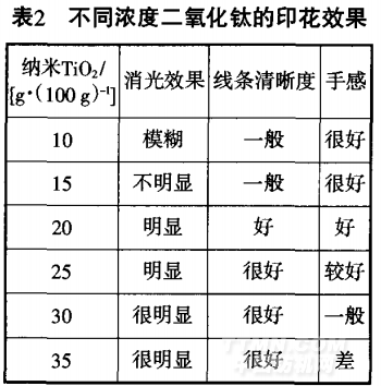 表2是不同浓度的二氧化钛对印花效果的影响。从表2中可以看出,纳米二氧化钛浓度在20~35 g/(100 g)时消光效果明显,线条清 晰度也较好,这说明要得到明显的 消光印花效果,效果剂必须具有一定的浓度;纳米二氧化钛浓度在 10~25 g/(100 g)时,手感较好,如果 浓度大于25 g/(100 g)时,虽然消光 效果好,但手感较差。这可能是由 于纳米二氧化钛浓度的增加。引起 涂料印花的涂层增厚,从而导致手感不好。