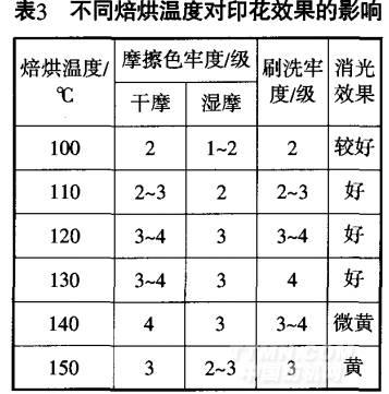 从表3可以看出,焙烘温度的变化对印花效果有一定影响,焙烘温度在100~130℃时消光效果较好;温度超过130℃时印花图案偏黄,可能是温度太高黏合剂有些泛黄;焙烘温度在100~1 10℃时各项牢度较差,这是由于温度太低,黏合剂没有完全发生交联反应。综合各项牢度和印花的消光效果,最佳焙烘温度应选在130℃。