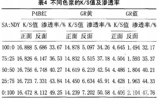 分别用P4B红、GR黄与GR蓝与五种复配糊料配 成色浆,然后印花,测得图案的K/S值与渗透率如下表4: