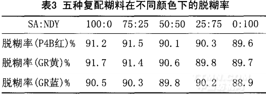 从表3可以看出,这几种糊料的脱糊率都比较 高,而且脱糊率都比较接近,因此手感均比较良 好,织物柔软程度基本差不多,用手摸基本感觉不 出差异。但是从数值上来看,NDY糊料的脱糊率还是 略低于海藻酸钠糊料,这主要是因为NDY糊料与织物 的亲和力比海藻酸钠强,在水洗的时候脱除略难。