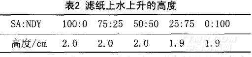 将原糊放入试管中,在原糊上插入1am左右的滤纸,并封住试管口,经过2h后滤纸上水上升的高度如表2