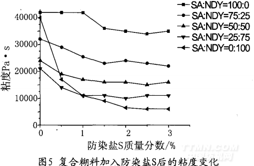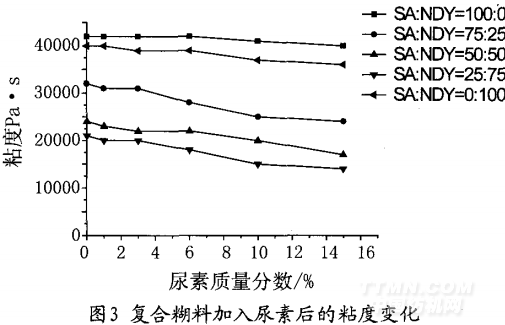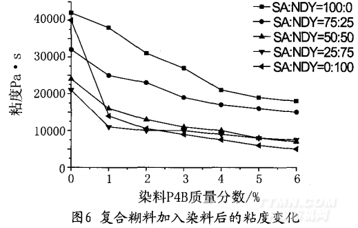 复合糊料与尿素、碳酸氢钠、防染盐S和P4G染料之间混合后的粘度如下: