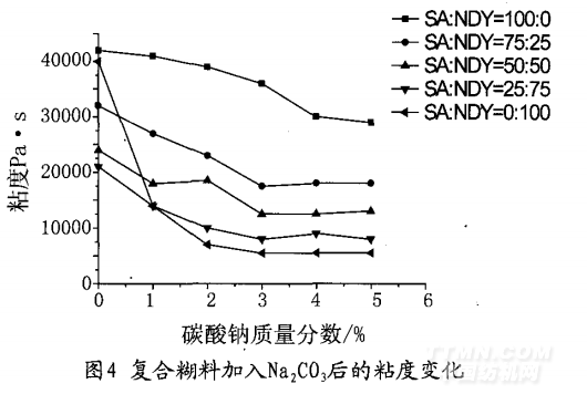 由以上4个图可以看出,五种糊料随着三种助剂 质量分数的增加,粘度均呈不同程度的下降。其中 纯海藻酸钠糊随加入助剂量的增加粘度变化最小, 说明它的化学相容性最稳定;纯NDY糊料的四条曲线都是最陡,说明其粘度变化最大,化学相容性最 差;其它三种复合糊料的粘度变化居两种纯糊料中 间。因为糊料中所加的助剂都是电解质,而海藻酸钠中所含的亲水性基团要比NDY少,NDY对电解质比 较敏感,粘度下降比较大。染料对两者糊料的影响 亦如此。