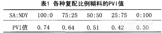 由表2可以看出,总体来说五种糊料的抱水性都差不多,纯NDY糊料及SA:NDY为1:3的复合糊料的抱水性要稍微优于其它三种糊料。因为NDY糊料中的亲水基团要多于海藻酸钠,所以水合能力要比海藻酸钠稍微强点。