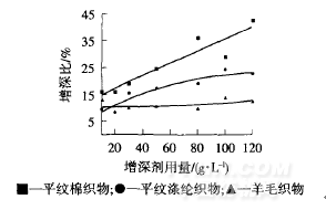 从图3可知,棉织物和涤纶织物的增深比均随增深剂用量的增大呈现上升趋势,但增深剂用量对毛织物的增深比无显著影响,其增深比保持在10%左右.当增深剂用量在20g/L以下时,毛织物的增深效果较之涤纶织物明显,高于2Og/L时,3种织物的增深比依次