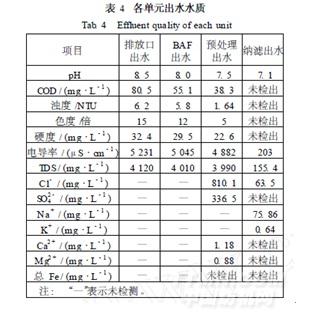 从表4可以看出,经该工艺处理后出水中二价以上的离子均未检出,一方面表明纳滤系统对二价以上的离子具有很高的去除率,另一方面也可能与进水的二价离子浓度较低有关。经组合工艺处理后出水中各主要水质指标均满足设计的回用水水质要求。