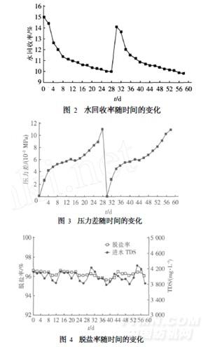 ③纳滤系统的水回收率随运行时间的延长而下降;压力差则随运行时间的延长而上升; 在进水TDS为3750~4280 mg/L时,纳滤系统的脱盐率为95.4%~96.6% ,平均为96.1%。系统运行28d时进行化学清洗,清洗后的水回收率可恢复至运行初期的94%;清洗前、后其脱盐率没有明显变化。