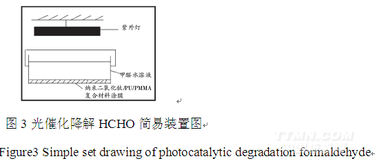 以降解低浓度HCHO溶液来评价核壳结构纳米TiO2/PU/PMMA复合材料涂膜的光催化活性。光催化降解装置由Luv紫外老化实验箱改装而成,该封闭反应器(15cm×15cm×4cm)由石英玻璃制成,取300mL浓度为7mg/L的HCHO溶液,在反应器底部涂上一层均匀的涂膜,涂膜与光源垂直,且光源中心距涂膜表面为10cm,具体反应装置如图3所示。光源为60W的紫外灯,光照时间为2h。采样后准确吸取5mL样品溶液于10mL比色管中,按绘制标准曲线的操作步骤测定吸光度。将测得的吸光度与标准曲线作对比,便可计算溶液中HCHO的降解率。