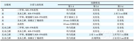 分别用水和无水乙醇作分散介质,测试改性纳米TiO2的分散性能。先分别加一定量水和无水乙醇于试管中,再取上述4种方法改性的目数相同的纳米TiO2 0.2~0.3mg投入其中,考察沉降性能,结果见表1。