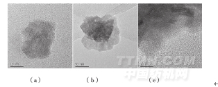 纳米TiO2粒子经表面改性后,采用强力超声,使其分散在水性聚氨酯乳液中,再采用原位种子乳液聚合,可合成实验设计的目标产物。由图4-a可见:核壳结构的中心具有明显的晶格条纹,为纳米TiO2所致,核的次外层主要为聚氨酯,最外层为聚甲基丙烯酸甲酯[7]。ZetaSizer3000HSA粒度仪测定其平均粒径在100nm左右。图4-b表明了核壳结构为多层结构。由图4-c可见:核壳两相界面处存在清晰的晶格条纹,表明核壳两相存在相渗透。可见纳米TiO2粒子结构本身不规则,在胶束中形成和长大时会形成镶嵌结构,即甲基丙烯酸甲酯在其表面聚合时会存在相互包埋的倾向,图4-a可以例证这一点,整个核壳结构仿佛是多个核壳结构经过一定作用力,形成中心核相互叠加的不规则结构。这可能因为在纳米TiO2异相成核时,即处在水性聚氨酯形成的胶束中时,不止一个纳米粒子被包覆在胶束中,在反应过程中由于外力作用,这些纳米粒子会形成各种不规则,甚至奇