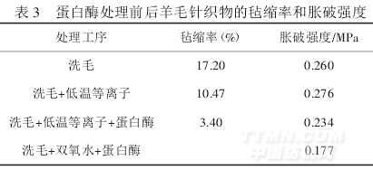 为进一步降低蛋白酶对羊毛的损伤,将低温等离子+蛋白酶+TG 酶联合对羊毛进行改性,分析改性后羊毛的毡缩性和胀破强度.结果如表6 所示.