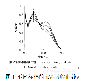 根据试验原理,随着反应体系中氟离子浓度的增加,红色减退,黄色增加,通过对空白和不同浓度显色剂条件下的试验结果扫描(如图1)后发现,在520nm左右吸光度随着氟浓度的增加而呈线性减弱,原因是茜素锆随氟浓度增加而减少.在420nm(茜素红的吸收)左右随着氟浓度增加释放出的茜素红越多,吸光度增加,线性略差.因而选择520nm作为测试波长具有更好的灵敏度.