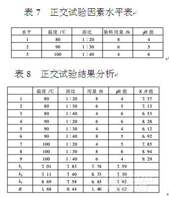 根据前述单因素试验结果,以染色温度、染料用量、pH值、浴比为影响因素,K/S值为判断指标,进行L9(34)正交试验,其因素水平见表7,结果见表8。