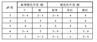 结合外,还存在范德华力和氢键等其它形式的结合力;当pH值高于等电点时,蛋白质纤维带负电荷,染料分子与纤维之间无离子键,只有范德华力和氢键。由表6可见,pH值在等电点附近时,染色织物色牢度比较好。
