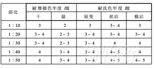 由表5可知,浴比为1∶10时色牢度较差。考虑实际情况,浴比选择1∶20、1∶30、1∶40较为合理。