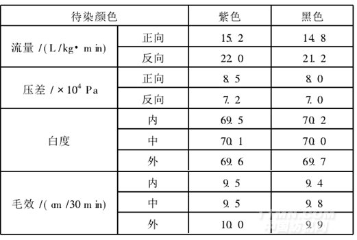 由表2可知,筒子内外层纱线煮漂后的白度和毛效基本一致,确保了内外层得色量一致。