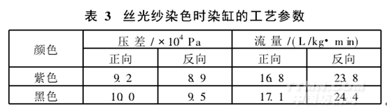 染色过程中,一般先将染料在化料桶中搅拌均匀后再加入料缸。对于翠蓝类大分子染料,加入化料缸前可采用滤网进行过滤。无机盐采用染缸循环水由快到慢添加盐。加工紫色时,采用90%的加碱功率;加工黑色时,采用50%的加碱功率。染缸的功率设定为85%,正反循环时间分别为6 min和4 min。染缸的流量和压差见表3。