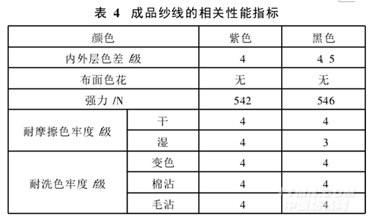 为了提高黑色纱线的耐摩擦和耐洗色牢度,后处理时皂洗剂和固色剂的用量需高于紫色纱线,且皂洗后增加一道热水洗。柔软剂采用弱阳离子型氨基硅油,并添加液体蜡以提高纱线的织造性能。纯棉丝光线筒子纱染色大生产的各项指标见表4。