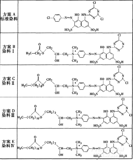 试验制得的功能性活性染料是在染料结构中引入柔软剂基团,棉织物采用该类染料染色时可同步获得柔软功效。试验采用的柔软剂基团是含有活性酯基的季铵盐组分。试验合成的4 只染料的差别是柔软剂基团的碳原子数不同。