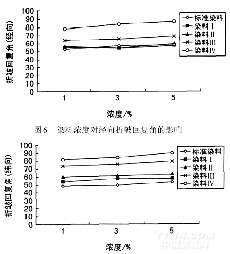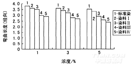 由图4 和图5 可知,标准染料染色织物的( 经纬向) 弯曲长度最高,而染料Ⅳ染色织物的弯曲长度最低。随着柔软剂基团中烷基数量的增加,织物经纬向的弯曲长度减少,且经向较纬向的弯曲长度降低更多。染色棉织物弯曲长度( 经纬向一致)大小排序如下: