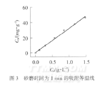 从表1及图4、5可看出,吸附数据用Langmuir方程拟合所得的线性相关系数R12>0.99,拟合后试验数据点基本分布在拟合直线上,而用Freundlich方程拟合所得的线性相关系数R22=0.9215,拟合后试验数据点杂乱无章,说明炭黑与超分散剂AFCONA-PF502之间的吸附行为符合Langmuir模型,属于单分子层化学吸附,原因是炭黑表面存在一定的官能团(如羟基、羧酸基、酚基、酯基或内酯基团等),砂磨分散过程中,这些官能团可以与超分散剂上的锚固基团形成多点氢键或化学键结合,以化学吸附的方式牢固吸附于炭黑表面,起到稳定的分散作用.