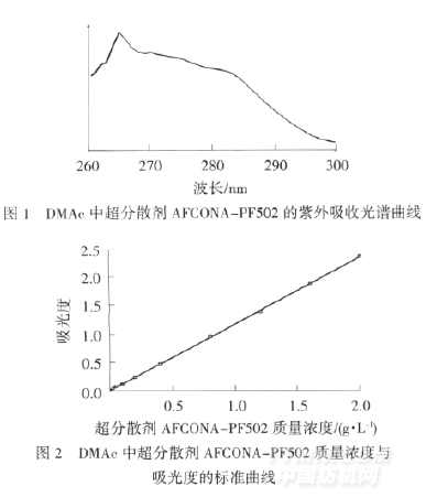 利用紫外可见分光光度计测试DMAc溶液中超分散剂AFCONA-PF502的最大吸收波长,从图1可以看出,它的最大吸收波长为266nm.在此吸收波长下,以吸光度对超分散剂的质量浓度作图,得到标准曲线(如图2所示),曲线呈现良好的线性关系,相关系数R2=0.9997.