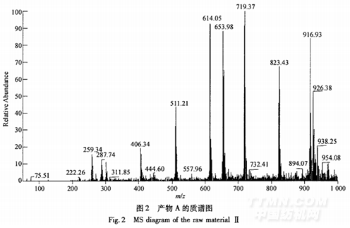 以4-枯基酚和苯乙烯为原料,酸性催化剂催化,在90℃下生成酚类产物,图l为酚类产物的质谱图,从图中可以看出,产物是数均分子量在1600HN以下的系列混合物,且低分子的响应信号比较强烈,说明酚类产物里含有未反应的原料、低分子的聚合物和较高相对分子质量的聚合物.酚类产物作为分散剂中的亲油基团,如果相对分子质量太小,会直接影响分散剂的亲油性,因此,在进行下一步反应前,将酚类产物碱洗2遍,水洗10遍,用以除去其中的低分子部分,作为产物A.图2为产物A的质谱图,从图看出相对分子质量在500以下的响应信号很弱,说明低分子物质基本不存在了,可以用来作下一步反应的原料.