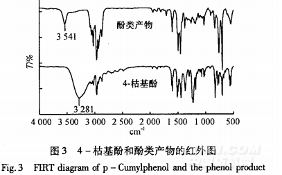 图3为4-枯基酚和反应后的酚类产物的红外谱图.图3显示,3281cm-1处有一强吸收峰,该峰为4-枯基酚中的0-H伸缩振动吸收峰,反应后该O-H峰变为3541cm-1,这是由于4-枯基酚接上苯乙烯后,基团的诱导效应和共轭效应导致羟基吸收频率发生位移,从而也证明了4-枯基酚已接上苯乙烯[6].