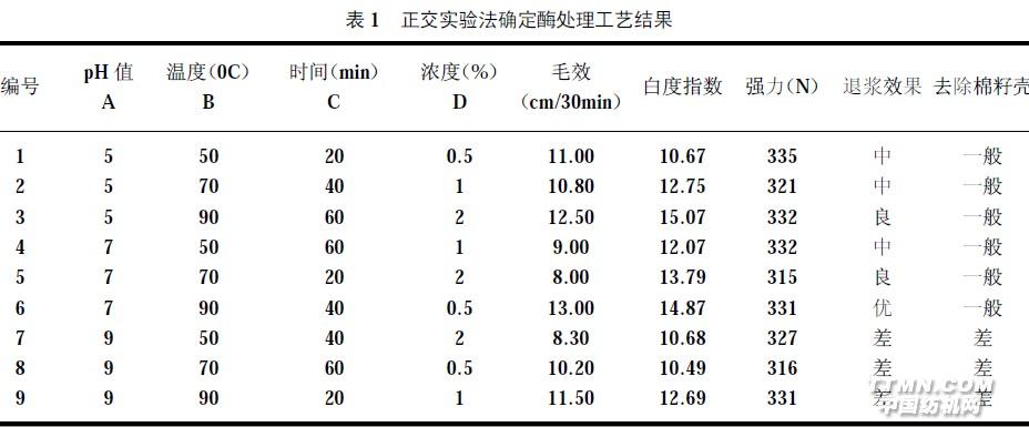 织物样品滴上几滴碘液(0.005 N),根据试液的呈色将退浆效果分为4 个等级:优-棕黄色(原色),良—里黄外偏蓝,中—蓝色,差—紫蓝或深蓝色。2.2.4.2 测试用碘液的配制方法:取18 克碘化钾和13 克碘溶解于水,使总量为1 升,再取此储存液5ml稀释到100 ml 即为测试液;储存液及测试液都要存放在深色瓶里,每次使用前需在淀粉上浆的织物原坯上点滴以检查其效能。2.2.5 断裂强力:将织物沿经向或纬向裁成5cm×35cm布条,采用YG2026型电子织物强力机测定。2.3 生物酶退浆工艺实验2.3.1 浸渍法工艺流程:酶退浆→热水洗→温水洗→冷水洗→烘干采用正交实验法确定酶处理工艺结果,见表1。