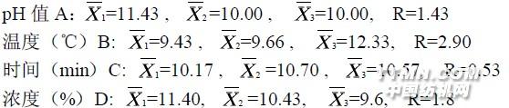 采用直观分析法求出极差,极差大者为主要因素,说明这个因素的不同水平对相应结果的影响较大,极差小者为次要因素,根据计算结果: