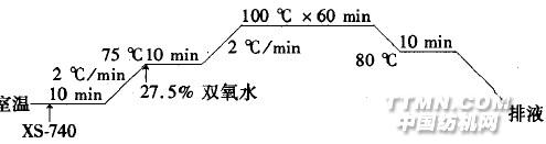 2 织物低温练漂与传统练漂工艺比较2.1 传统间歇式一浴一步法练漂工艺实例一工艺流程练漂一热水洗(95℃ ×5 min)一热水洗(8o oC×5 min)一冷水洗一冷水洗一酸处理(调节pH值6)一去氧酶处理(60℃ ×20 min)一染色或增白(不排液)练漂工艺处方/(g/L)氧漂特效助剂XS-740 2.227.5%双氧水/(mL/L) 8浴比 1:8—1:15练漂工艺曲线