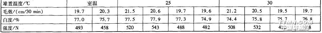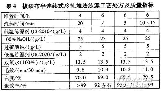 2.2.2 半连续式冷轧堆法练漂(1)18.4 rex X2普纱棉针织双面布(表3)工艺流程浸轧(室温,一浸一轧,轧液率100%~ 150%)一堆置一漂后95℃处理15 rain(36。B6烧碱2 g/l,,Ql~-2OlO 0.5 g/l,)一排液一水洗(60 oC ×20 min)一排液一冷水洗(10 min)一酸处理(98%醋酸调节pH值6~7)一排液(2)梭织布(表4)工艺流程 浸轧(二浸二轧,轧液率80% ~100%)一堆置一汽蒸(100℃)一水洗(36。B6烧碱2 L,Ql~-2OlO 0.5 g/l,,90 oC X 10 min)一排液一水洗(60 oC×20 min)一排液一冷水洗(10 rain)一酸处理(调pH值6~7)一去氧酶处理由表3,4可看出,低温练漂剂QR一2010(浸轧专用)、QR一201 1、QR一2020用于棉织物半连续式冷轧堆练漂工艺,可缩短堆置时间(从传统冷轧堆练漂工艺的l6~24 h缩短至4~6 h),提高毛效(从传统冷轧堆练漂工艺的0~6 cm/30 min提高到10 cm/30 miin以上),节省能源、减少污水排放和缩短加工时间。