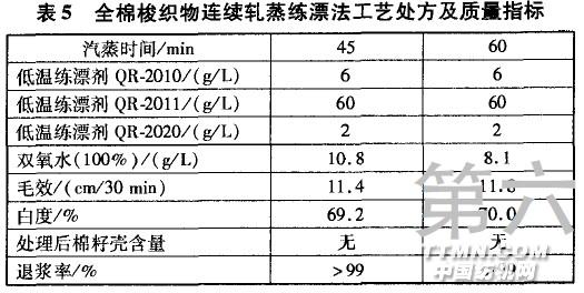 2.2.3 连续式轧蒸法练漂(表5)织物全棉梭织物工艺流程二浸二轧(30℃ ,轧液率90%)一汽蒸(100℃ ×45 min或60 min)一水洗(36。B6烧碱2 g/L,QR 2010 0.5 L.95 oC ×10 min)一排液一水洗(6O oC×20 min)一排液一冷水洗(10 min)一酸处理(98%醋酸调节,pH值6~7)一去氧酶处理一染色