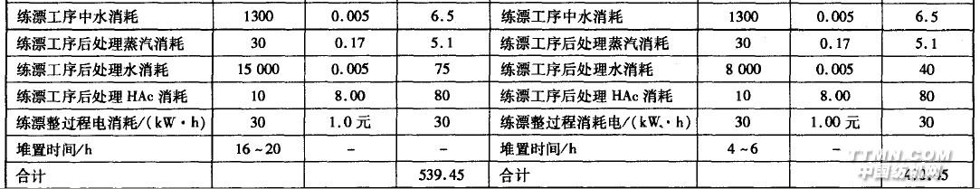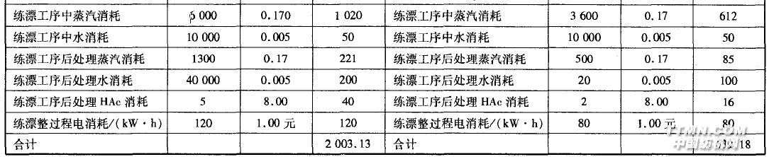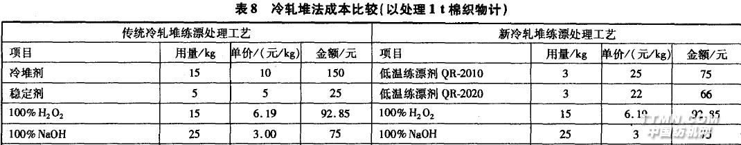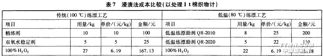 注:()中的数据系与表2相关用量比较o(2)采用低温练漂工艺,当双氧水用量与传统工艺相同时,其白度比传统工艺高。(3)QR-2011不宜用普通烧碱(或36。B6烧碱)替代,因为其练漂后易洗涤,且不会引起破洞。否则,其练漂质量可能会发生变化。(4)QR一2010有浸渍法专用和浸轧法专用两种剂型,前者泡沫少。(5)染色时使用固色碱QR—KN代替纯碱固色,可节约成本,且色泽与纯碱固色相当。3 经济效益比较低温练漂工艺与传统工艺效益比较见表7,8。