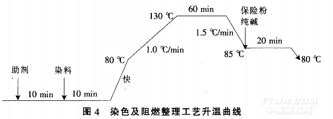 2.2.1染色加料时应严格按顺序加入.加料完毕后应让设备运转10 min.然后再升温.这样染料和助剂 能够均匀地分散到染液中去 保温 时间不能少于50 min.否则将影响 织物的阻燃效果
