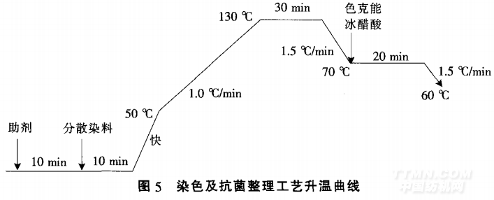 染色工艺流程:装锅一去油(去油剂ZS一100为1 g/L,98 ºC,20 min)一热水洗(80℃,20 min)----溢流水洗(10 min) 染色及抗菌整理、还原清洗一热水洗(60℃,l0min) 溢流水洗(10 min,pH值6.5~7.0)一亲水性柔软整理(亲水性柔软剂DT一6400为2~3 g/L,40