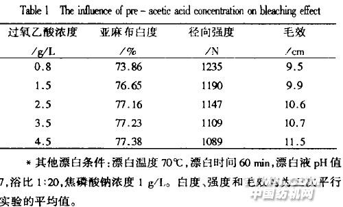 研究结果表明,随过氧乙酸浓度的增加,亚麻布的白度增加,但增加的幅度不大。特别是过氧乙酸浓度达到2.5g/ L以上时,白度增加缓慢,同时漂白布的径向强度却有一定程度的下降。显然,从降低漂白工艺成本和减少漂白过程中强度损失的角度考虑,过氧乙酸的浓度必须控制在合适的范围内。毛效是衡量亚麻纤维表面浸润性的指标,纤维表面的木质素是影响其毛效的重要因素。所以,漂白亚麻布的毛效是木质素去除率的直接反应。表1数据表明,过氧乙酸对木质素有良好的去除作用,随其浓度的增加,漂白布的毛效有明显的增加。1.2.2 双氧水复漂现行漂白企业标准L4』要求亚麻布白度为80—84% ,从表1数据可以看到,只用过氧乙酸很难达到企业标准的要求。继续增加过氧乙酸的浓度白度增加很小但亚麻布的强度却在下降,另外,增加过氧乙酸的浓度使漂白成本增加,所以在实际工业生成中不能只用过氧乙酸为漂白剂。由于在过氧乙酸漂白过程中大量的木质素已经除去,所以可以用双氧水复漂来提高白度,实验结见表2。