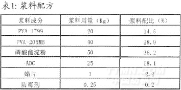 由于本产品为纯棉细特高密织物,总经根数多、经纱密度大,浆纱采用24只经轴进行并合,织轴幅宽277.5cm,上浆困难,加之纱线较细,强力较低,织造难度系数也大。如果上浆率偏小,或者上浆不匀,则不能很好的伏贴毛羽,容易造成断经,再加上高速喷气织机开口又小,如果开口不清,极易造成阻纬,导致产生疵布。因此,此品种上浆时既要有较好的浸透以适当增强,又要有良好的被覆以贴伏毛羽,并形成柔韧光滑的浆膜以增加耐磨,以保证开口清晰,适应喷气织机高速、大张力的织造要求。本着既能达到上浆质量、满足织造及成品要求,又尽量少用PVA、减少环境污染,同时兼顾浆纱成本的原则。采用的浆料配方如表1所示:
