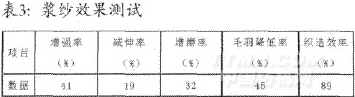 使用上述浆纱工艺后,经纱浆膜完整、手感滑爽、毛羽减少,强力得到明显改善,浆轴质量真正得到提高,促使织机经纬纱断头数降低,在ZAX9100-280喷气织机上,速度430转/min,织造效率较好。成布花型立体感强,布面匀整丰满,达到了预期效果。
