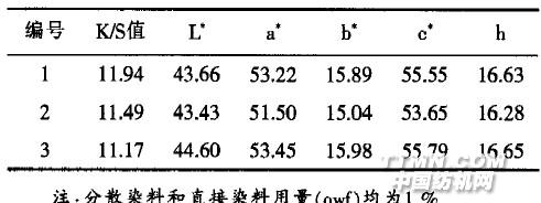 从表2中数据可以看出.随着双氧水用量的增加,织物染色后K/S值反而稍有减小,说明双氧水用量的增大,使织物的白度提高,所以织物的表观色深则降低。