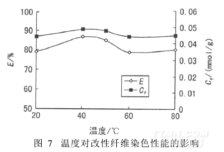 从图7可以看出,随着温度的升高,上染百分率略有增加,超过50℃后,又略有下降,但整体看,直接桃红12B上染百分率的变化不显著。因此,取室温(20℃左右)染色为宜。
