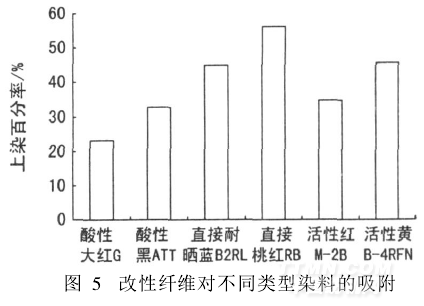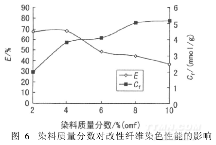 从图6可以看出,直接桃红12B上染百分率随着染料质量分数的增加而下降,而上染量增加。直接桃红12B在质量分数不大于4%时,上染率较高。因为改性纤维上存在可供染料定位吸附的位置,当染料质量分数较低时,染料可以充分上染即占据染座;当染料质量分数较高时,相对而言纤维上可吸附的位置减少,上染百分率降低,而纤维上吸附染料量仍呈增加趋势。综合考虑,选用染料质量分数4% (omf)较好。