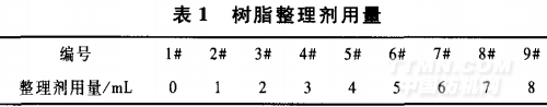 分别采用树脂整理剂,树脂整理后用有机硅柔软剂进行柔软整理。树脂整理工艺处方:总液量 100 mL,树脂整理剂用量按表1安排,pH值7~8。