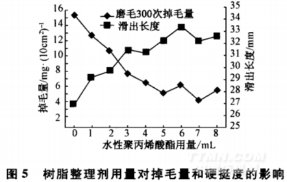 通过添加自制的树脂整理剂,焙烘后使织物和 整理剂、整理剂问发生化学交联,阻止纤维问的滑 移,从而达到防掉毛的效果。图5是用自制树脂整 理剂整理后织物的掉毛量以及硬挺度的变化情况。 从图5看出,整理剂用量为5 mL时可得到较为满意 的防掉毛效果(掉毛量减少60%以上),超过5 mL, 织物的掉毛量上下波动,这可能因为过剩的整理剂 自身发生交联反应,再增加整理剂用量意义不大,反 而会使织物的硬挺度增加,影响手感。此外,在整理 剂达到一定量后出现滑出长度变小的情况,可能是 织物上发生交联的整理剂过多,导致了质量的增加。