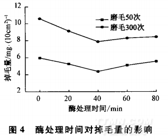 图4是用量为2%(owf)的酶液处理不同时间 后织物掉毛量的变化情况。如图4所示,织物在酶 处理40 min时达到最佳防掉毛效果,延长时间对防 掉毛效果不利。由此得出在用酶处理进行兔毛防掉 毛整理时,一定要严格控制工艺条件,否则将会不利 于防掉毛整理的效果。
